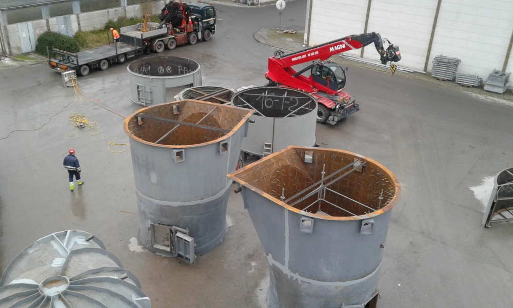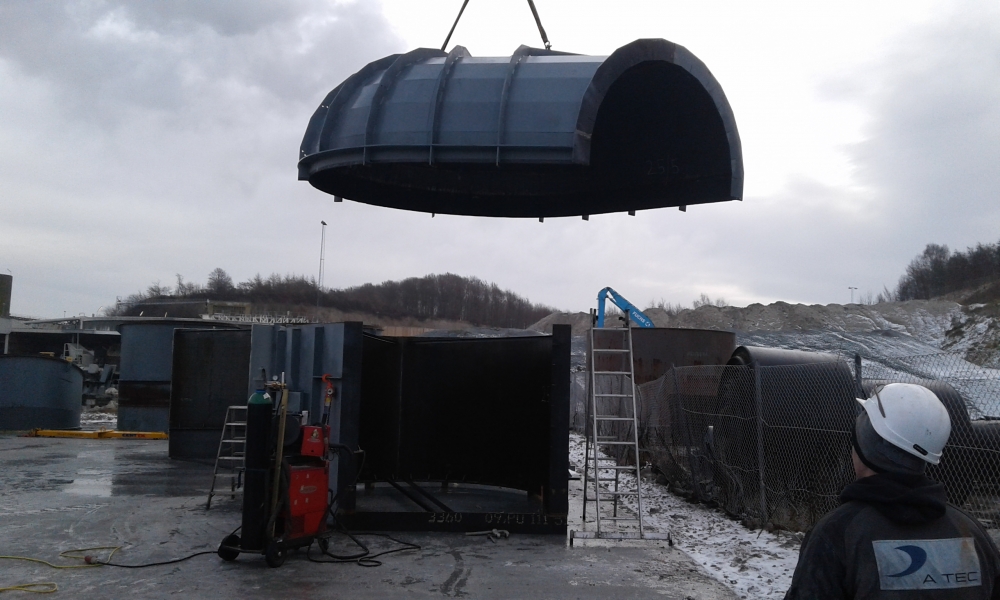 Der Kalzinator wurde großteils in fertigen Schüssen von 4-5m Länge und 3,5m Durchmesser geliefert. Alle anderen Rohrleitungsteile wurden in Segmenten geliefert und von unseren Mitarbeitern auf der Baustelle in Aalborg im Jänner und Februar 2017 vormontiert und fertig verschweißt.